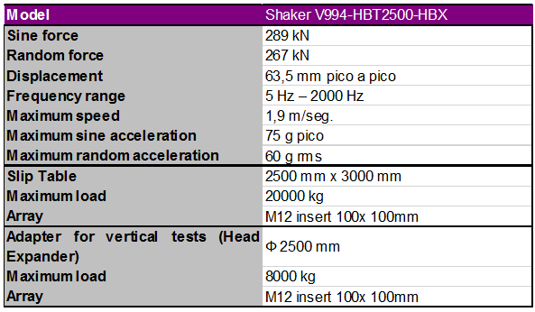 - Aceleración máxima seno: 69 g vertical, 22 g con slip table