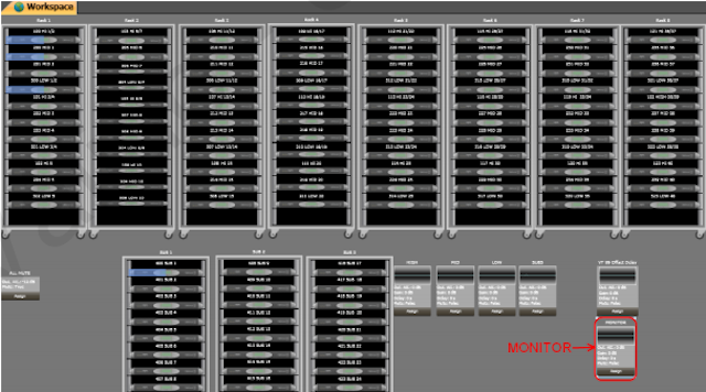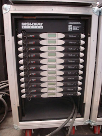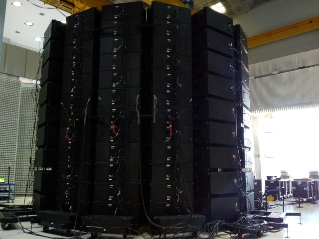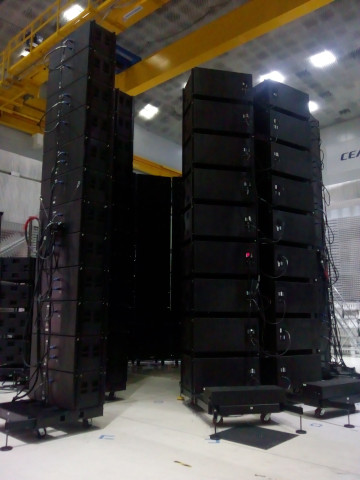 Se compone principalmente de torres de parlantes y racks de amplificadores que se arman en el lugar del ensayo, es decir es portable.